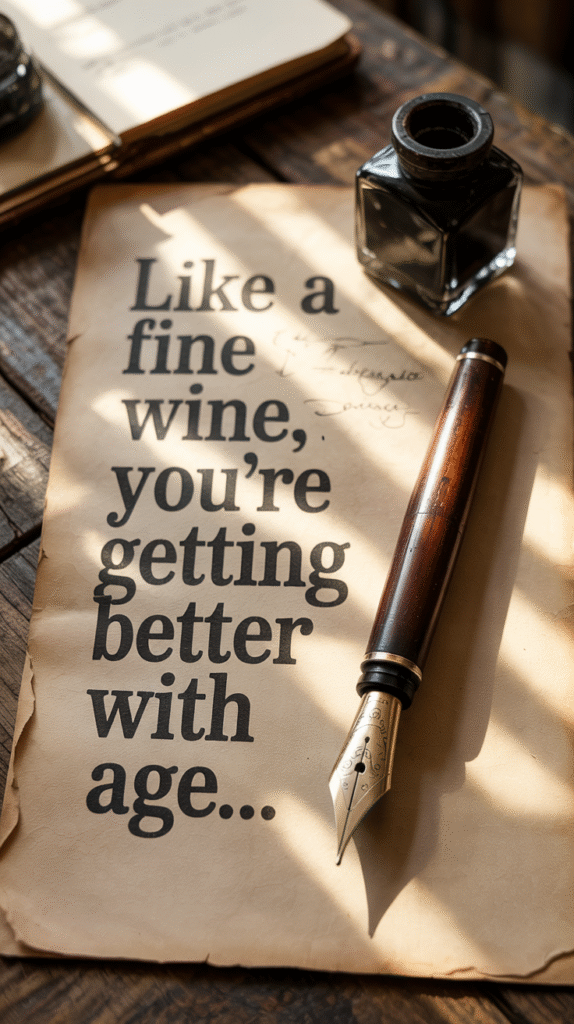 60. “Like a fine wine, you’re getting better with age.” – Unknown Meaning: Suggests improvement and refinement come naturally with passing years.